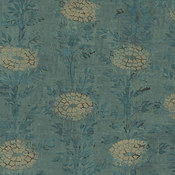 The French Marigold wallpaper surprises with a rhythmic repetition of French marigolds, a herbaceous plant with generous inflorescences. Arranged in vertical columns, the metallic round flowers stand out against a textured background. Fine stems, embellished with elongated leaves, structure this stylized floral pattern. Signed York, this composition evokes a traditional aesthetic with refined accents.