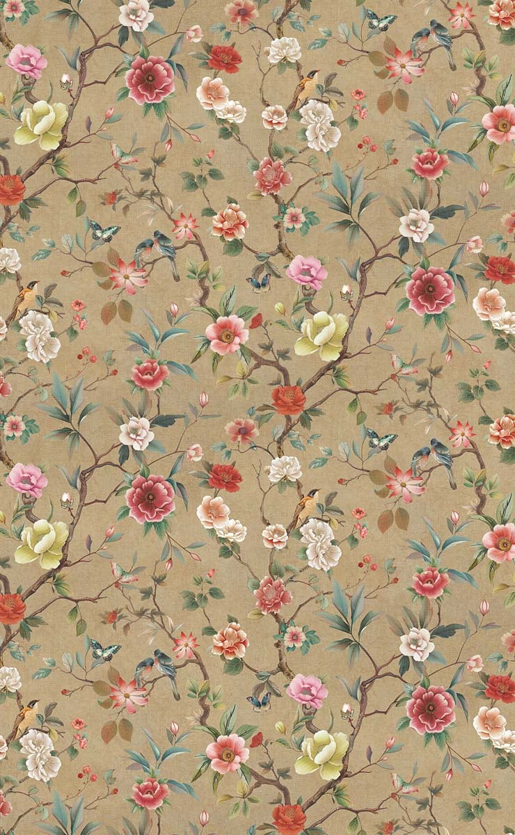 Kimora's Garden wallpaper displays a poetic garden frozen in time. Sinuous branches unfold on the surface, laden with blooming flowers with delicate petals. Small birds perch among butterflies and foliage, in a lively composition. Designed by York, the floral pattern evokes a painting of yesteryear, rich in stylized details.