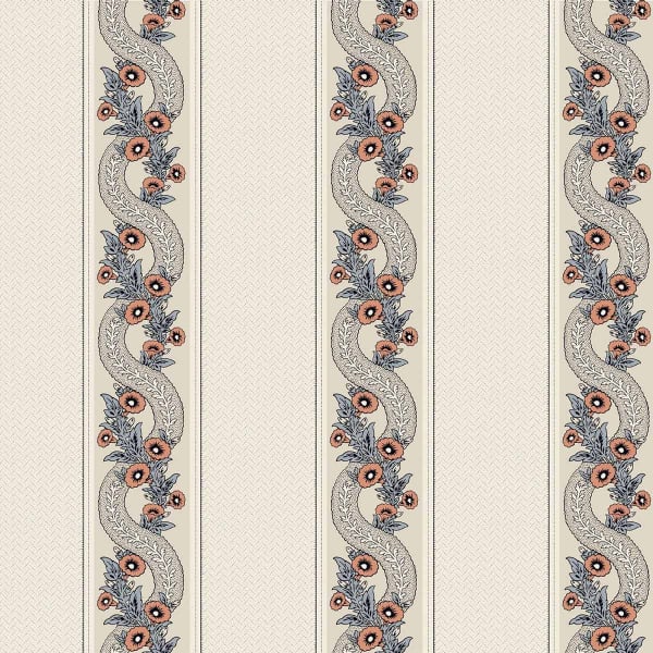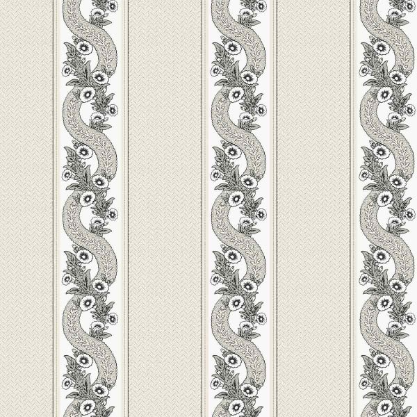 Abbey's Garland wallpaper juxtaposes floral and geometric elements in a composition by York Wallcoverings. A sinuous frieze rises between sober bands, forming arabesques bordered by vines and bells. These decorative curves alternate with structured columns with a finely rhythmic design. The whole reveals a subtle balance between ornamentation and graphic rigor.