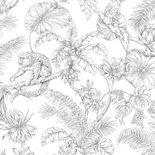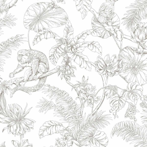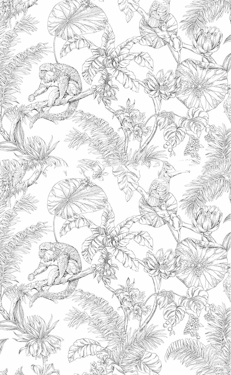 Tropical Sketch Toil illustre une jungle foisonnante, où faune et flore s’entrelacent. Ce papier peint, signé York Wallcoverings, met en scène un motif tropical à l’encre, peuplé de toucans, de singes et d’une végétation dense. Chaque feuille, chaque fleur, chaque animal se dessine avec une précision quasi-scientifique. Le trait fin rappelle les planches botaniques anciennes, dans une composition à la fois structurée et vivante.