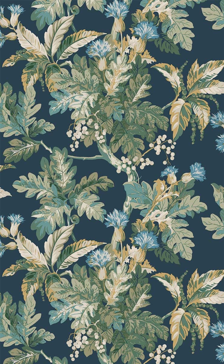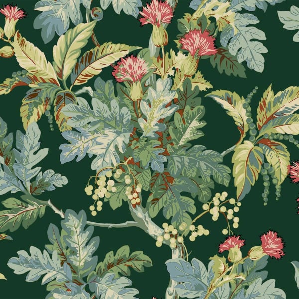 Briarwood wallpaper unfolds like a plant fresco where large leaves intersect and intertwine with grace. On its surface, a botanical pattern enriched with clusters of berries and bursting flowers evokes the vitality of a wild garden. The design highlights the delicacy of the shapes and details. This wallpaper by York Wallcoverings is anchored in a timeless aesthetic.