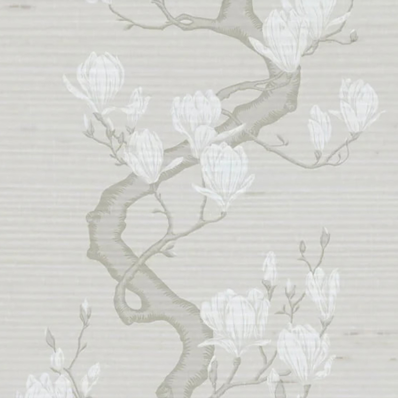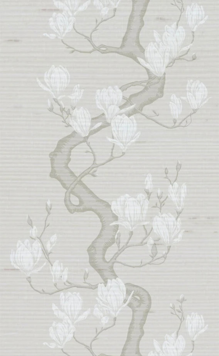 The Magnolia Tree Silk wallpaper features a floral pattern inspired by an archival work, repainted by hand. On a subtly textured background reminiscent of silk, it unfolds sinuous branches and blooming flowers. The whole draws a vertical rhythm that discreetly animates the surface. Cole and Son offers a composition where graphic details meet the natural elegance of the medium.