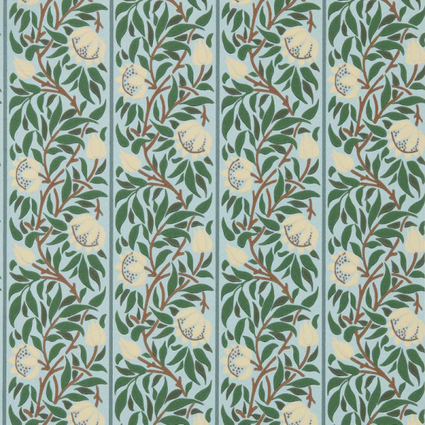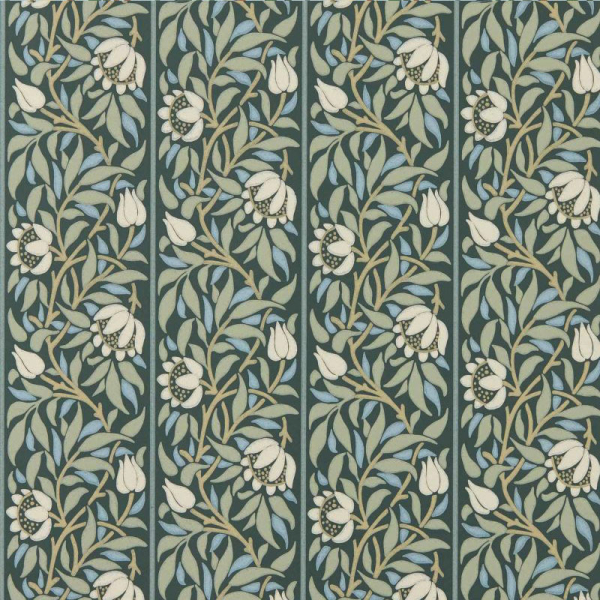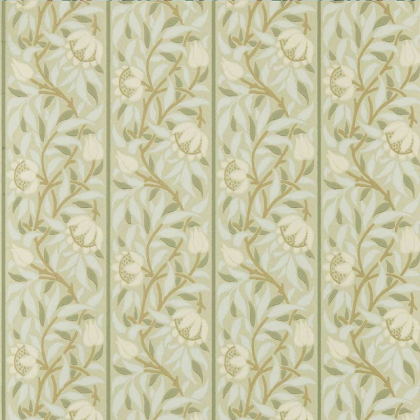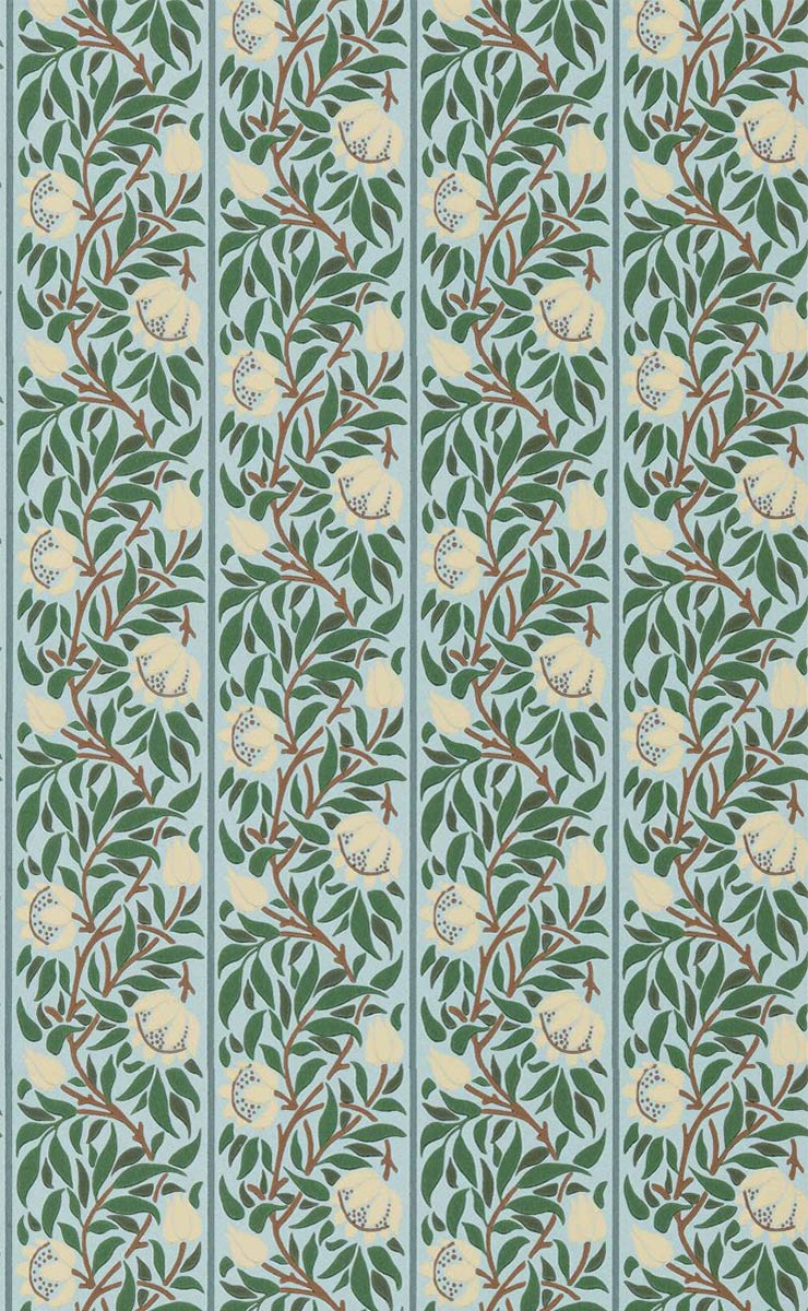 Morris and Co's Peony Trellis wallpaper reveals a rhythmic floral pattern, formed by stylized peonies and closed buds intertwined in a vertical trellis. Each stem rises in a scroll, framed by dense foliage. The whole composes a harmony of lines and curves, faithful to the spirit of Arts and Crafts, in a balanced composition, both decorative and soothing.