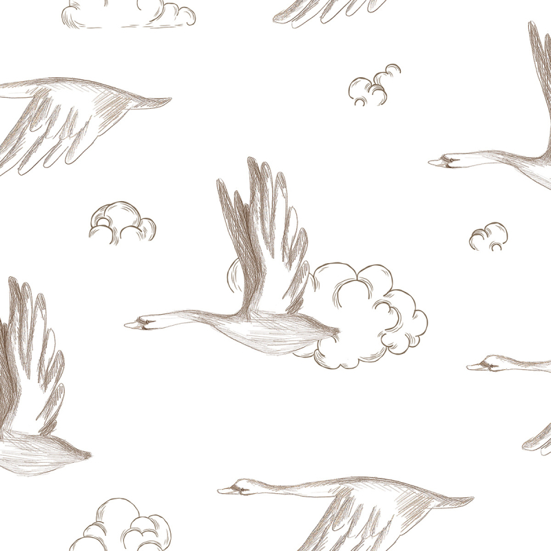 Un motif animalier, esquissé avec finesse, anime le papier peint panoramique Natural Oies. Des silhouettes élancées d’oies migratrices sillonnent un ciel léger, ponctué de nuages dessinés à main levée. Chaque trait suggère le mouvement fluide des ailes et la grâce des oiseaux. Dans une composition répétitive et harmonieuse, ce modèle évoque une impression de liberté paisible.