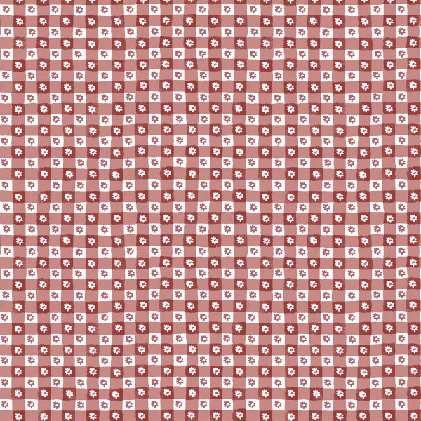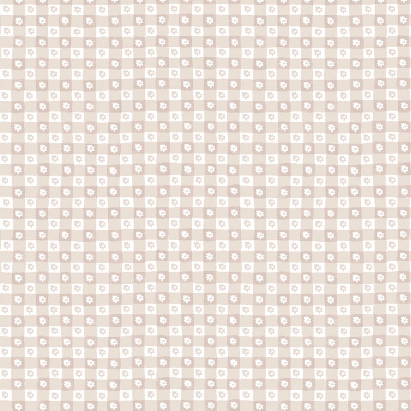 with a floral checkerboard pattern, inspired by a traditional gingham. Each square alternates between a solid color and a small illustrated daisy, in a style that is both geometric and rustic. This regular composition evokes a classic textile revisited with sobriety. Published by Rifle Paper Co., this wall covering has a measured structure with a discreet charm.