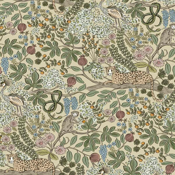 Signed by Rifle Paper Co., a plant and animal motif runs through the surface of the Safari adhesive wallpaper. The scene evokes a lush jungle where each branch becomes a living theater. Leopards rest among the foliage, monkeys explore the treetops, while cranes and snakes hide in lush vegetation. This wallpaper unfolds a tropical fantasy on a self-adhesive backing.