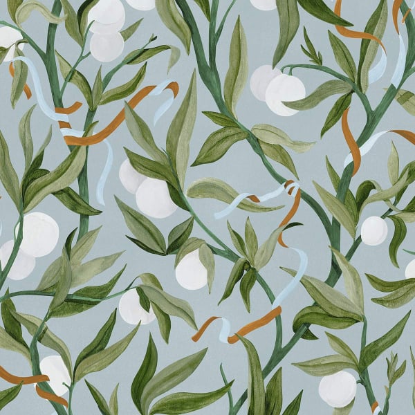 The Orchard wallpaper reveals a hand-painted, orchard-inspired plant motif. Flexible branches rise in a joyful tangle, laden with round fruits and delicate foliage. Every detail, from the fluid lines to the organic rhythm of the curves, reflects a sensitive look at nature. This wall covering by Les Dominotiers infuses a luminous and nuanced softness.