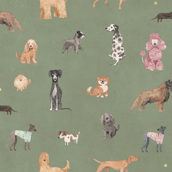 A joyful farandole of dogs brings the panoramic wallpaper Taiga and Friends to life, a touching model by Sandberg. The figurative motif displays four-legged companions in various postures. Hand-painted, they each have their own personality, between a playful gait and a mischievous look. Each detail composes a playful scene with a delicately naive charm.
