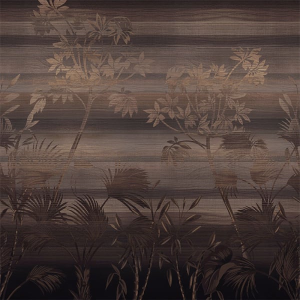 Emberwood Symphony panoramic wallpaper reveals exotic vegetation, with silhouettes of trees that evoke a forest at dusk. The irregular embossed texture and horizontal lines draw a dense material with deep shades. Every detail fades into the mist, as if absorbed by the light. This enveloping composition by Londonart suggests the stillness of a secret landscape.