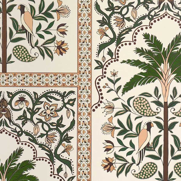 Schumacher's Amazonas Mystique wallpaper unfolds a botanical fresco. Stylized palm trees, exotic birds, and floral arabesques intertwine in a rhythmic framework on the surface. The tropical motif evokes a distant inspiration with Indian prints, amplified by a structured decorative network. The whole creates a vibrant, abundant atmosphere, evocative of a lush and enchanted jungle.