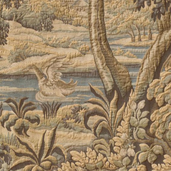 Arte presents the Bucolique wallpaper, a poignant evocation of an imaginary landscape reminiscent of an old tapestry. Two swans glide across the water in the heart of a wooded clearing bathed in silence. The meticulously crafted graphic pattern evokes the look and feel of a period textile, with its interplay of volumes and textures. Together, these elements create a peaceful scene that seems almost suspended in time.