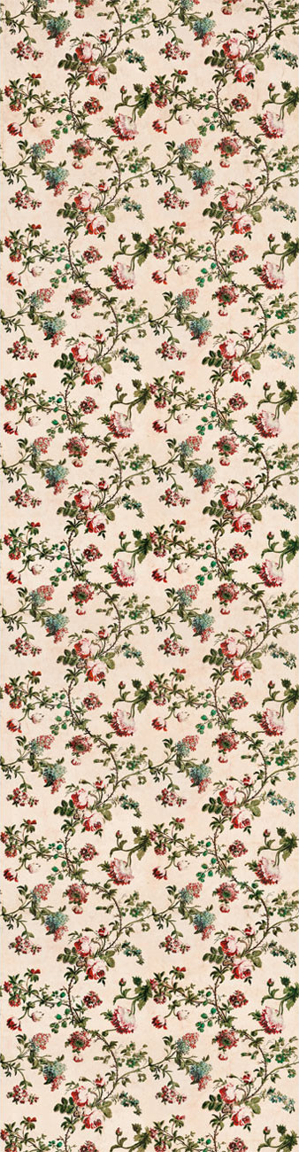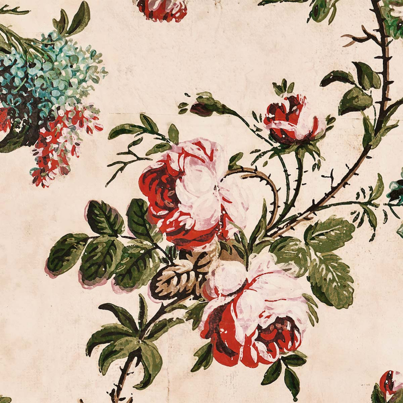 The Nouvelle Héloïse wallpaper by Le Grand Siècle features a lush floral motif. Originally displayed on the walls of Madame de Warens' bedroom (Maison des Charmettes, Chambéry), who was Jean-Jacques Rousseau's patron and close companion during his early years, it reveals a typical 18th-century Indian print pattern composed of roses, lilacs, and wildflowers blooming against a plain background. The design evokes an old painting, with each stem intertwining gracefully. The overall effect is a delicate decoration that rhythmically punctuates the wall and structures the space.